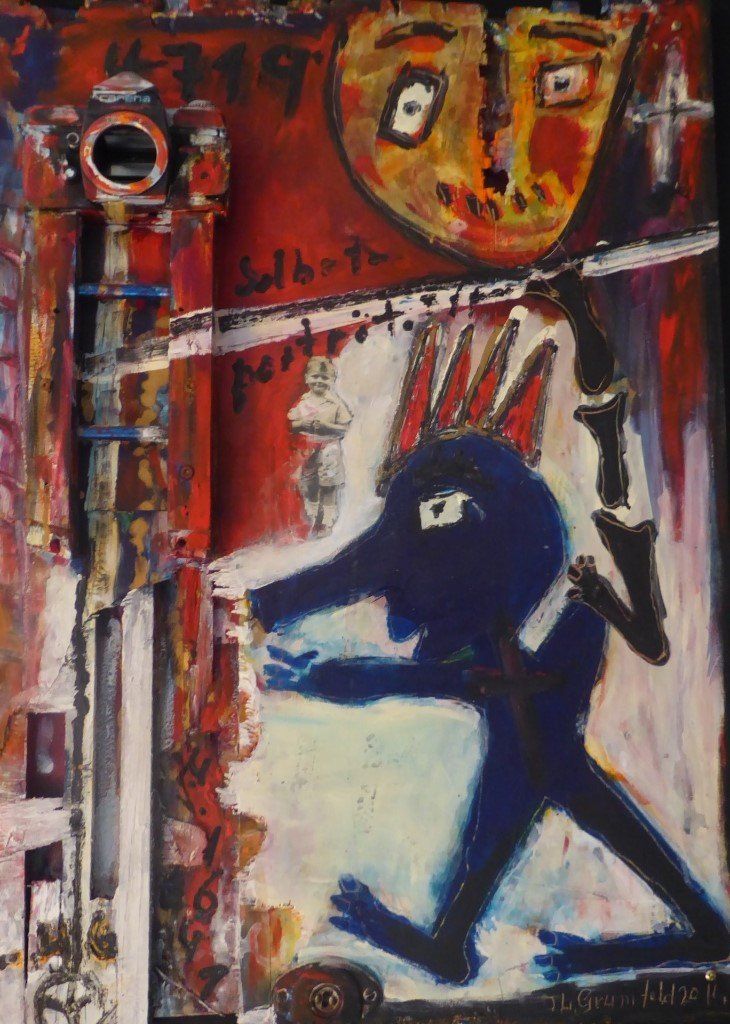 Josef Lange-Grumfeld spielt mit Formaten und Materialien. Auch in der Farbgebung ist er sehr variable, wobei schwarze und weiße Linien sowie rote und blaue Flächen hervorstechen. Die Farbe Grün findet man er seltener. Das einzige Material, mit dem Josef Lange-Grumfeld anscheinend noch nicht gearbeitet hat, ist der Werkstoff Glas. Sicherlich ist die Umsetzung seiner durch die frei schwebenden Knochenelemente geprägten Figuren und Fabelwesen in flüssig und heiß zu verarbeitendes Glas eine besondere, auf den ersten Blick schier unmöglich scheinende Herausforderung. „Das schaffen nur die Besten aus der Gilde der Glasmacher, wenn überhaupt“ schätzt er die Realität sofort treffend ein. Obwohl die vielfältigen gestalterischen Möglichkeiten des Mediums Glas mit den ungeahnten Möglichkeiten zur Ausnutzung des Zusammenspiels von Farbe und Licht natürlich eine reizvolle Aufgabe für den mir Farben und Elementen spielenden Künstler ist.