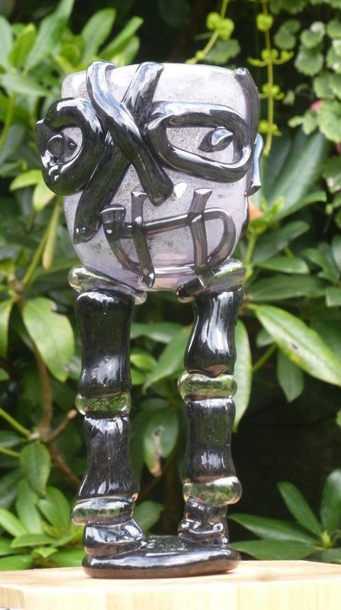 Mit diesem Glasobjekt sind wir in einer Welt voller knöchernen Existenzen und Fabelwesen angelangt, in der bunten und fröhlichen aber zugleich mahnenden und beängstigenden Welt von Josef Lange-Grumfeld.