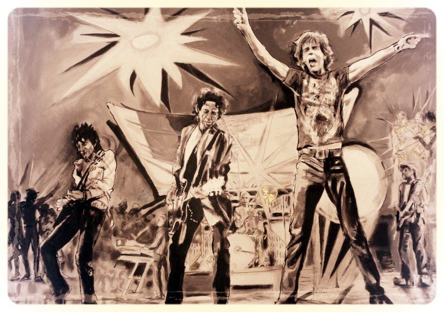 Der Musiker, der seine Leidenschaft als Maler am häufigsten und wohl auch am perfektesten umgesetzt hat, ist vermutlich Ron Wood von den „Rolling Stones“. Richtig berühmt geworden ist Ronnie durch seine Karriere als Musiker, insbesondere als Mitglied der legendären Bands „Jeff Back Group“, „Small Faces“ (die sich später dann „The Faces“ nannten) und natürlich der „Rolling Stones“. Bevor Ron Wood mit seiner Karriere als Musiker begann, erhielt er ein „art training“ am „Ealing College of Art“ in London, er studierte also Malerei. Das Talent war ihm in die Wiege gelegt worden. Bereits im Alter von 10 Jahren wurden seine ersten Zeichnungen im „BBC’s Sketch Club“ im Fernsehen vorgestellt. Später erhielt er einen „Job“ als „Künstler“: er malte für eine Agentur Plakate mit den Aufschriften „For Sale“, „Sold“ und „For Rent“.