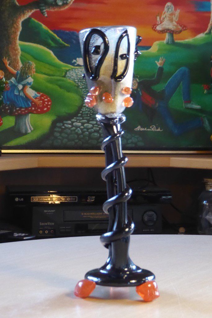 Mit diesem Glasobjekt sind wir in einer Welt voller knöchernen Existenzen und Fabelwesen angelangt, in der bunten und fröhlichen aber zugleich mahnenden und beängstigenden Welt von Josef Lange-Grumfeld.