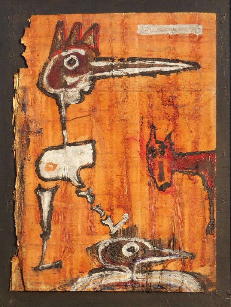 Josef Lange-Grumfeld spielt mit Formaten und Materialien. Auch in der Farbgebung ist er sehr variable, wobei schwarze und weiße Linien sowie rote und blaue Flächen hervorstechen. Die Farbe Grün findet man er seltener. Das einzige Material, mit dem Josef Lange-Grumfeld anscheinend noch nicht gearbeitet hat, ist der Werkstoff Glas. Sicherlich ist die Umsetzung seiner durch die frei schwebenden Knochenelemente geprägten Figuren und Fabelwesen in flüssig und heiß zu verarbeitendes Glas eine besondere, auf den ersten Blick schier unmöglich scheinende Herausforderung. „Das schaffen nur die Besten aus der Gilde der Glasmacher, wenn überhaupt“ schätzt er die Realität sofort treffend ein. Obwohl die vielfältigen gestalterischen Möglichkeiten des Mediums Glas mit den ungeahnten Möglichkeiten zur Ausnutzung des Zusammenspiels von Farbe und Licht natürlich eine reizvolle Aufgabe für den mir Farben und Elementen spielenden Künstler ist.