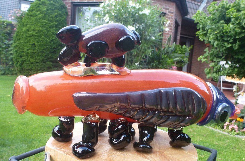 "Wenn der Vater mit dem Sohne ..“ ist ein .sehr aufwendiges Glasobjekt als Unikat. Die Skulptur gehört zu der Serie "Fische auf Reisen".