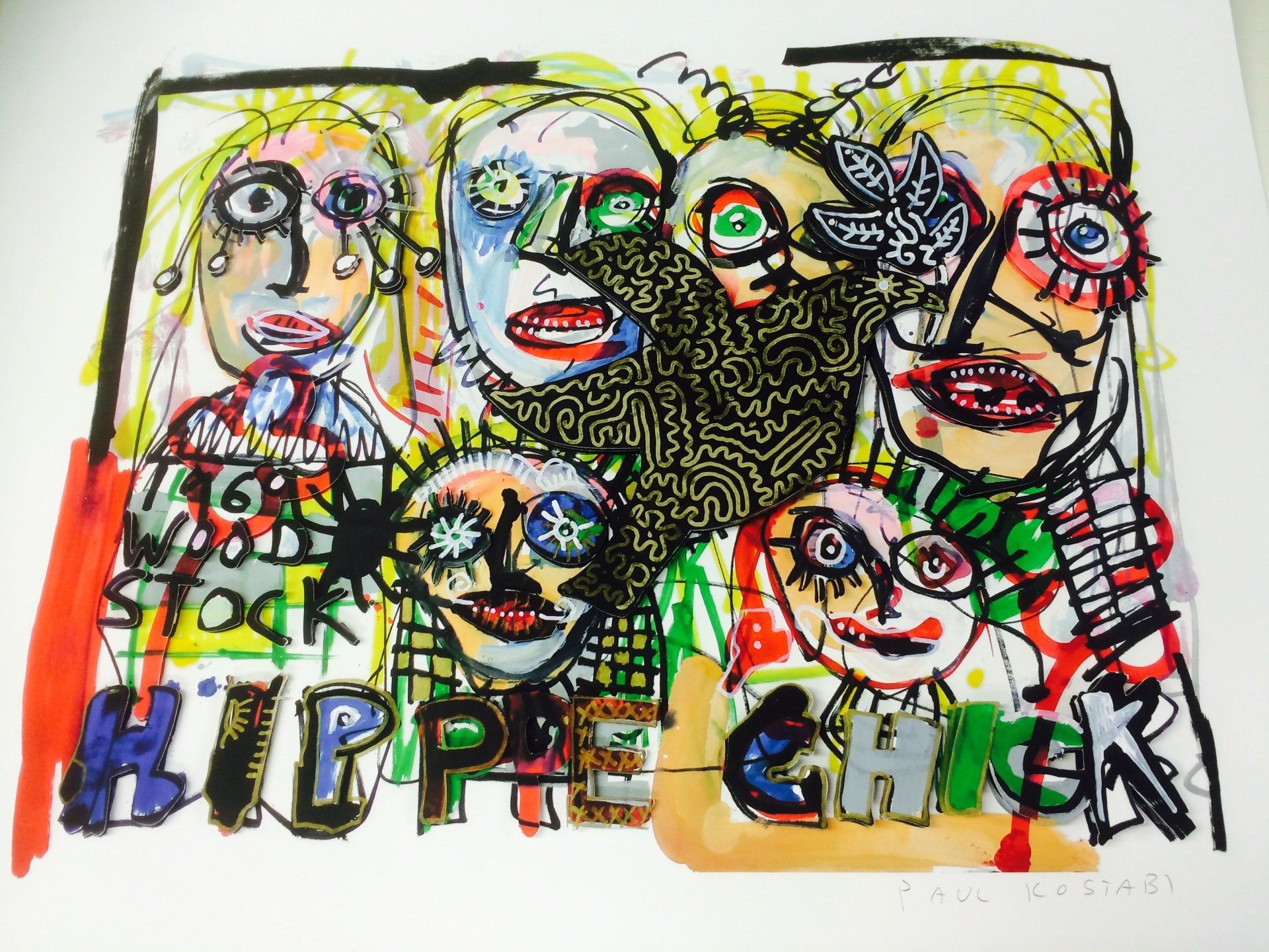 Ein Bild zum Thema Woodstock und Friedensbewegung. Dazu hat Paul Kostabi die fröhlichen Hippies mit der Friedenstaube im Vordergrund geschaffen. Die Taube: das Symbol für den Frieden mit dem Palmenblatt im Mund, von den 68ern liebevoll als "Hippie Chick" bezeichnet und von Paul in seiner eigenen Art in "Hipppe Chick" umgewandelt.